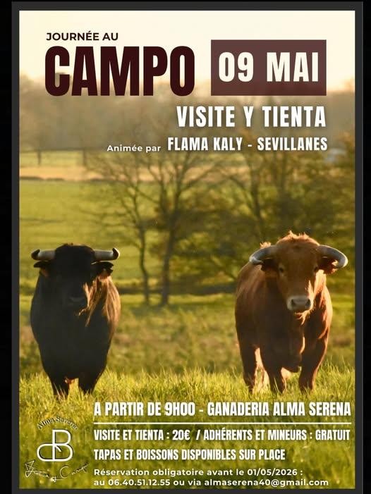 Pour participer à la journée? Possibilité de prendre la carte socios dès maintenant ou participation de 20€ à régler sur place. La tienta et la visite sera gratuite aux socios et aux mineurs. Réservation obligatoire avant le 01/05 par téléphone au 06.17.51.59.97 ou au 06.40.51.12.55 ou par mail : almaserena40@gmail.com