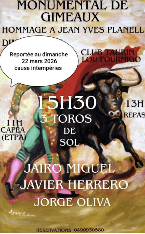 Cette fois ce sont les intempéries prévues sur le sud-est qui entrainent le report de la fiesta campera à la monumental de Gimeaux. Nouvelle date choisie : 22 mars. Cartel et programme inchangés.