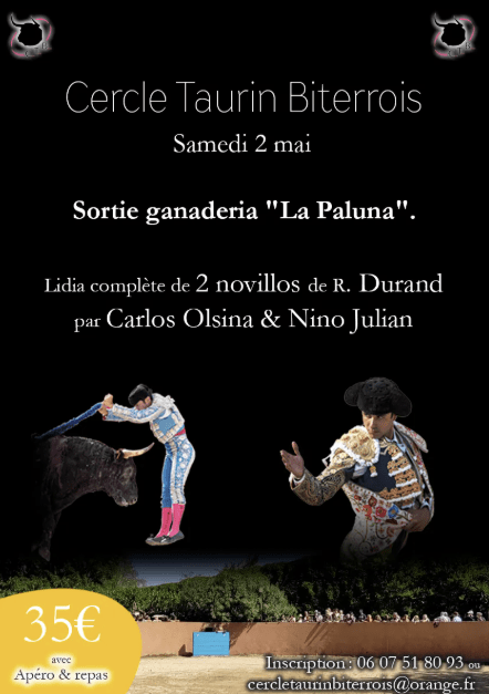 Lidia complète de 2 Novillos de R.Durand par Carlos Olsina et Nino Julian. Tienta d’une vache (La Paluna) par Esteban Navarro (élève de l’École Taurine Béziers Méditerranée) – Apéro et repas.