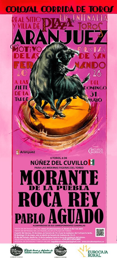 Carlos Zúñiga, empresa de Circuitos Taurinos, a dévoilé le cartel de la corrida du 31 mai à Aranjuez. Il a composé une affiche de « luxe » avec Morante de la Puebla et Roca Rey aux côtés de Pablo Aguado. Les toros seront de Núñez del Cuvillo.