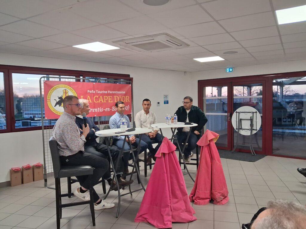 Yannick Boutet et son fils Volodia ont évoqué leurs parcours en tant qu’alguaciles et leur rôle lors d’une corrida. Mathieu Guillon a expliqué le rôle des banderilleros avant et pendant la corrida et ce qui fait qu’il est passionné par ce métier. La conférence s’est terminé par un joli moment de transmission.  Mathieu a donné quelques conseils au jeune parentissois Maxence qui débutera en non piquée le 05 juillet à Boujan.