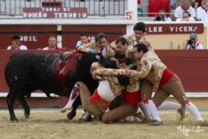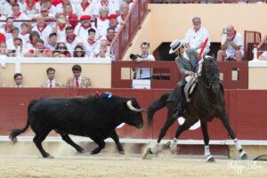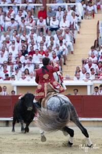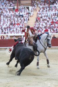 Il y avait un monde à partce samedi, celui de Guillermo Hermoso de Mendoza qui nous a gratifié d’une démonstration de toreo à cheval face au meilleur toro de l’après-midi noble et mobile. Il faut dire que les premières séances « d’attape-moi si tu peux » templées au millimètre avaient rapidement fixé le Romao Tenorio. Le récital fut couronné généreusement d’un rabo qui accompagna deux oreilles parfaitement méritéés. Vuelta pour le toro. Plus quelconque fut sa prestation au dernier, il est vrai bien moins collaborateur.