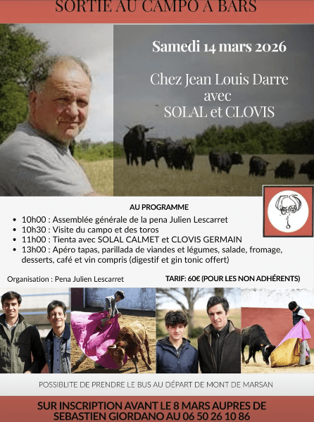 La peña Julien Lescarret organise une sortie au campo le 14 mars 2026 chez le ganadero Jean-Louis Darré, à Bars. Au programme : visite du campo, tienta avec Solal Calmet et Clovis Germain, suivie d’un repas convivial. Inscriptions ouvertes jusqu’au 8 mars.