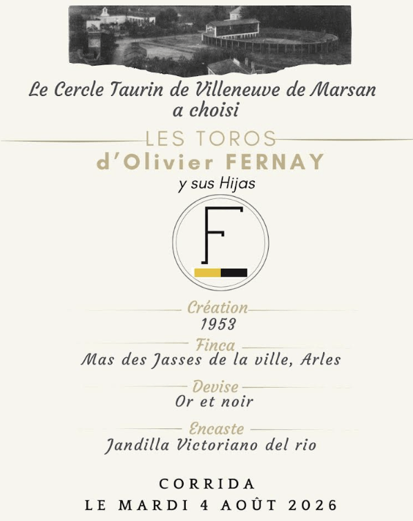 Le Cercle Taurin de Villeneuve de Marsan a choisi sa ganadéria pour la corrida qui se déroulera le mardi 4 août 2026. C’est la ganaderia d’Olivier Fernay y sus hijas, située aux portes d’Arles qui a été retenu.