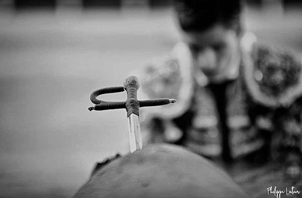 La main gauche a un rôle essentiel. Les anciens disent que c’est elle qui tue. Elle fixe la tête du toro le plus bas possible ce qui permet de placer l’épée et de passer la corne droite.