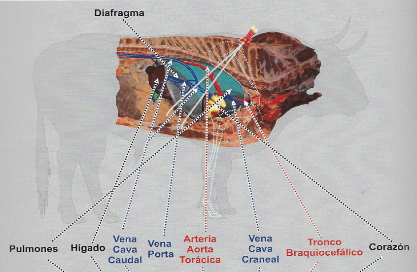Pour comprendre ce qui se passe au moment de l’estocade, il est intéressant de faire un peu de leçon de choses. Lors de l’estocade, l’épée rentre dans la cage thoracique du toro. Dans cette région se trouve les organes essentiels pour la respiration et la circulation sanguine.