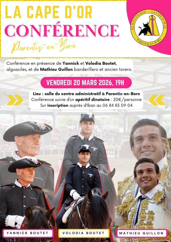 La peña parentissoise La Cape d’Or organise sa seconde conférence taurine le vendredi 20 mars à 19h au centre administratif de Parentis. Elle accueillera pour l’occasion les alguaciles Patrick et Volodia Boutet ainsi que le banderillero Mathieu Guillon.