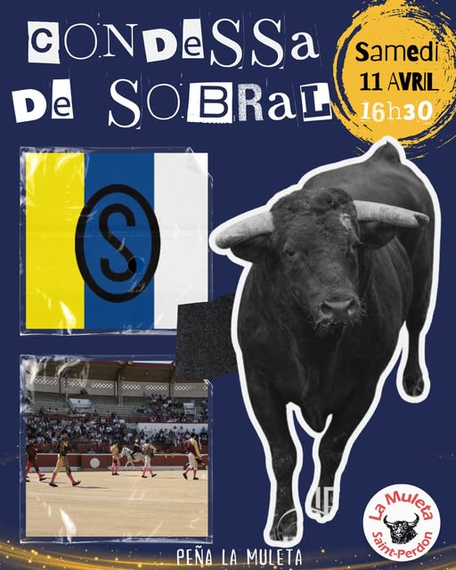 Pour la deuxième année consécutive, la Peña La Muleta de Saint-Perdon annonce les novillos de la ganaderia portugaise Condessa de Sobral seront combattus aux arenes du Plumacon pour la novillada de Saint-Perdon qui aura lieu le Samedi 11 Avril à 16h30.