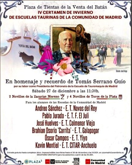 Pour celles et ceux qui sont du côté de Madrid, à la Venta del Batán le 27 décembre, 4ème Certamen d’hiver des écoles taurines de la communauté de Madrid. Andreo Sánchez, Pablo Jurado, José Huelves, Brahian Osorio ‘Carrita’, Óscar Campos et Kevin Montiel affronteront du bétail de Zacarías Moreno et Toros de la Plata.