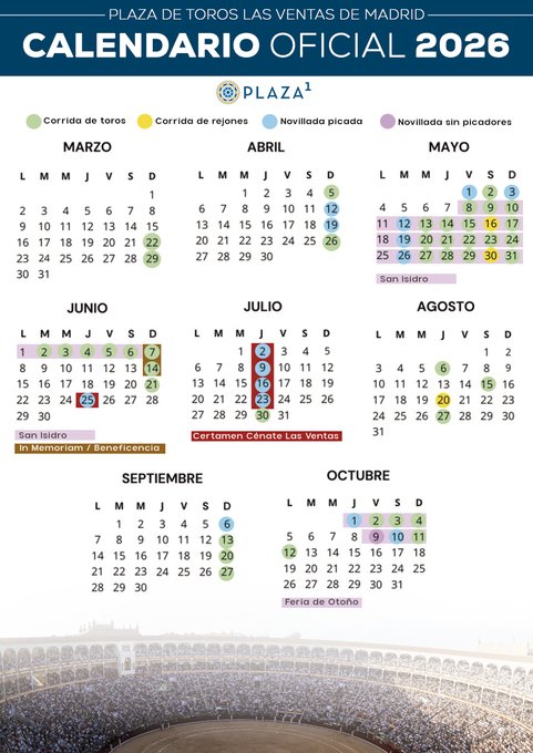 Le coup d’envoi de la saison sera donné par une corrida de toros le 22 mars. La Feria de San Isidro se déroulera du vendredi 8 mai au samedi 7 juin, avec les dimanches 8 et 14 juin inscrits en rouge au calendrier, à l’occasion des corridas In Memoriam et de la Beneficencia. Une corrida supplémentaire, programmée le dimanche 21 juin, servira de prélude au certamen de novilladas nocturnes « Cénate Las Ventas ».