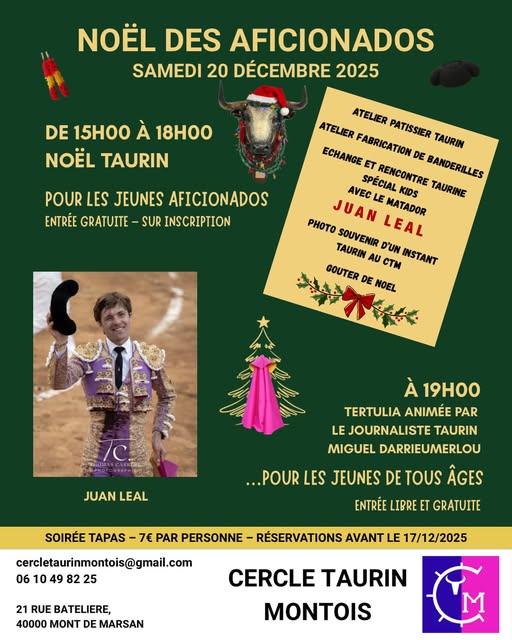 Inscriptions (pour l’après-midi) et réservations (pour la soirée tapas) : cercletaurinmontois@gmail.com – 06 10 49 82 25. Cercle Taurin Montois – 21 rue Batelière, 40000 Mont-de-Marsan