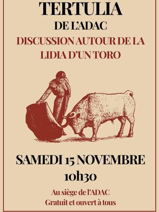 Au siège de l’ADAC à Céret, samedi 15 novembre à 10h30. Tertulia autour du sujet « Discussion autour de la la lidia d’un toro »