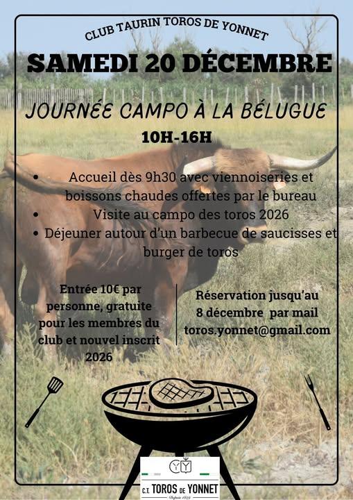 Le Club taurin toros de Yonnet organise une journée campo au Mas de La Belugue le samedi 29 décembre de 10h à 16h. Entrée 10€ par personne, gratuite pour les membres du club ou nouvel inscrit 2026.