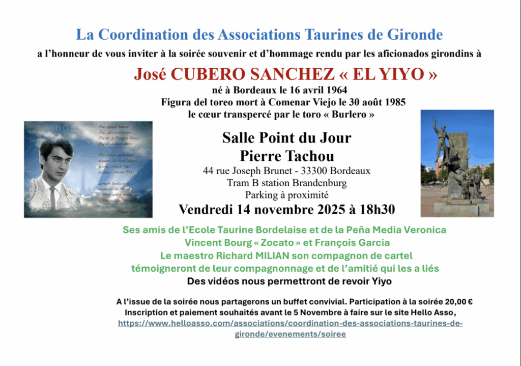 La coordination des Associtaions Taurines de Gironde oraganise une soirée hommage au jeune torero né à Bordeaux, tué dans l’arène par le toro Burlero en 1985 à l’âge de 21 ans. Ce sera le vendredi 14 novembre au 44 rue Joseph Brunet à partir de 18h30. Vous pouvez encore réserver votre place jusqu’au 5 novembre (organisation oblige) en vous connectant directement sur le site de Hello asso: https://www.helloasso.com/associations/coordination-des-associations-taurines-de-gironde/evenements/soiree