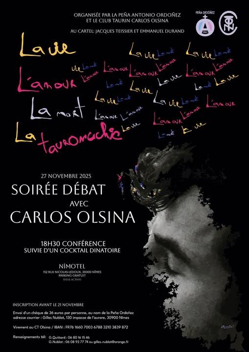 Soirée-conférence exceptionnelle autour d’un thème fondamental et passionnant qui touche à l’essence même de notre culture : la tauromachie. Ce débat aura pour invité d’honneur le Torero Carlos Olsina et pour grands témoins le père Jacques Teissier, aumônier des arènes de Nîmes et Emmanuel Durand, grand aficionado et écrivain, pour la défense de la tauromachie.
