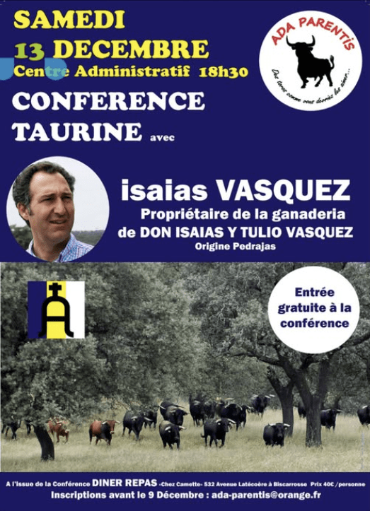 Le 13 décembre, conférence organisée par l’Ada avec Isaias Vasquez propriétaire de la ganaderia Isaias y Tulio Vasquez. Ce sera à 18h30 au centre administratif de Parentis-en-Born. Entrée libre.