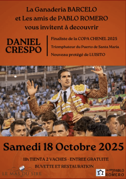 La veille du festival « 1 Toro pour 1 Rêve d’enfant » où il est au cartel, vous pourrez découvrir Daniel Crespo dont la seule incursion dans l’hexagone fut à Bayonne en 2022. Ce sera le 18 octobre au mas du Sire