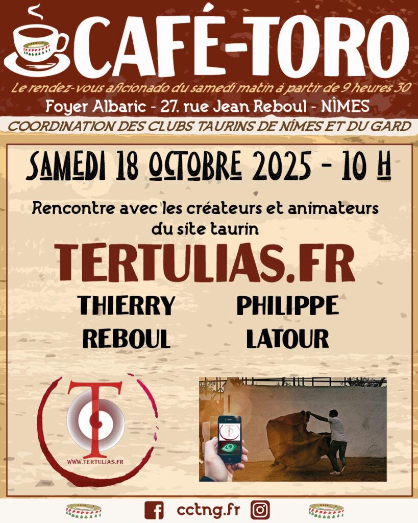 Nous aurons le plaisir de venir à votre rencontre le 18 octobre prochain à Nîmes lors du prochain Café Toro. Rendez-vous à partir de 10 heures au foyer Albaric au 27 rue Jean Reboul