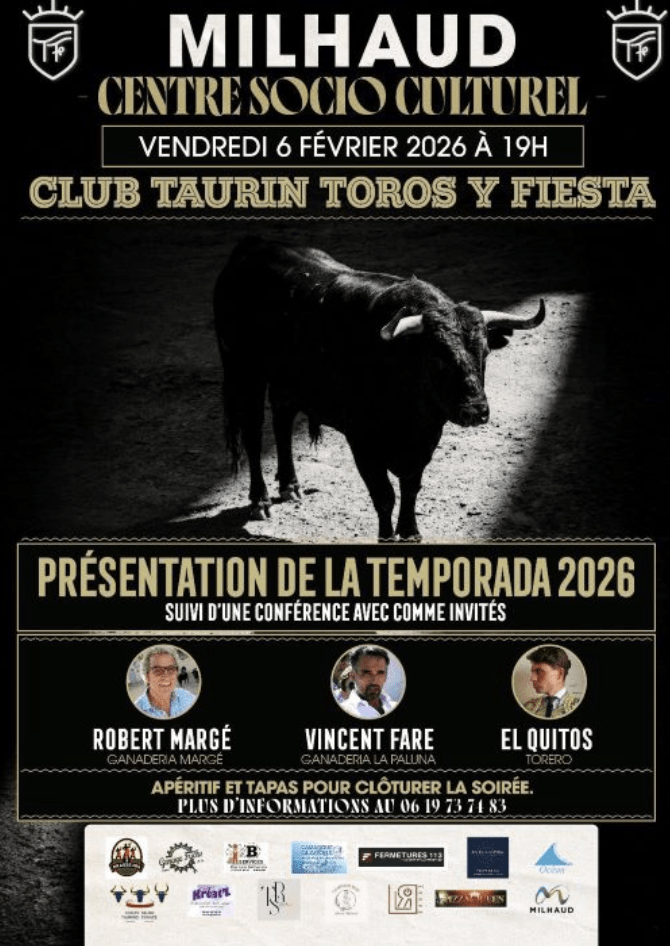 A Milhaud, le vendredi 6 février à 19 heures, le Club Taurin Toros y Fiesta présentera la temporada 2026 avec comme invités Robert Margé, Vincent Fare, El Quitos. Apéritif et tapas suivront. Renseignements 0619737183