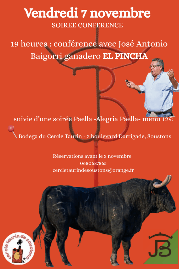 Le Club Taurin de Soustons propose une conférence le vendredi 7 novembre dans son local du 2 Boulevard Darrigade. Elle recevra à partir de 19 heures, le ganadero Navarrais, José Antonio Baigorri « El Pincha ». La conférence sera suivie d’un repas paella. Renseignements et réservations 0680687865 ou cercletaurindesoustons@orange.fr (avant le 3 novembre).