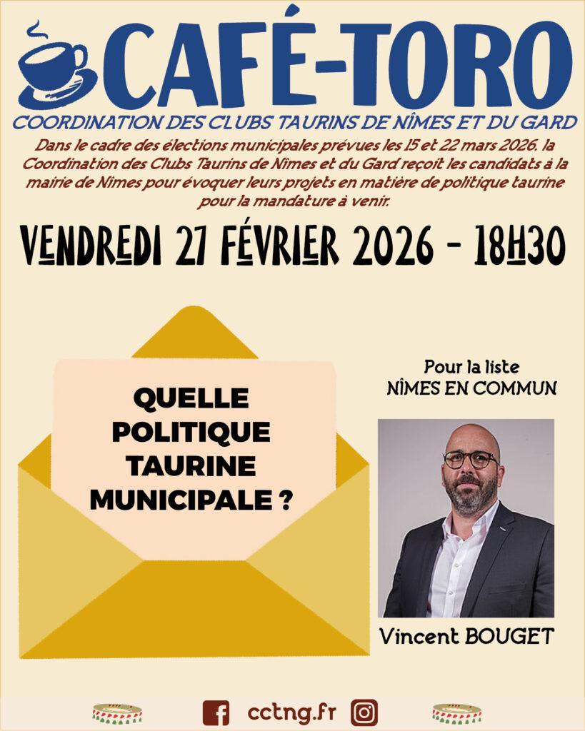 La Café Toro reçoit vendredi 27 février à 18h30 au 27 rue Jean Reboul à Nîmes, Vincent Bouget (PC) qui conduit la liste « Nimes en Commun » pour les municipales. Il présentera ses propositions en matière de politique taurine.