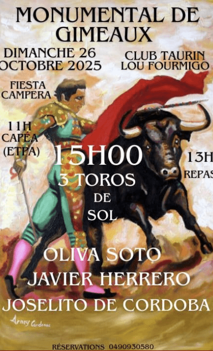 Le Club Taurin Lou Fourmigo organise le dimanche 26 octobre sa traditionnelle Fiesta Campera. A 15 heures , 3 Toros de Sol seront combattus par Oliva Soto, Javier Herrero et Joselito de Cordoba. En matinale, capea avec les élèves de l’école taurine du Pays d’Arles. A 13 heures, repas. Réservations au 0490930580;