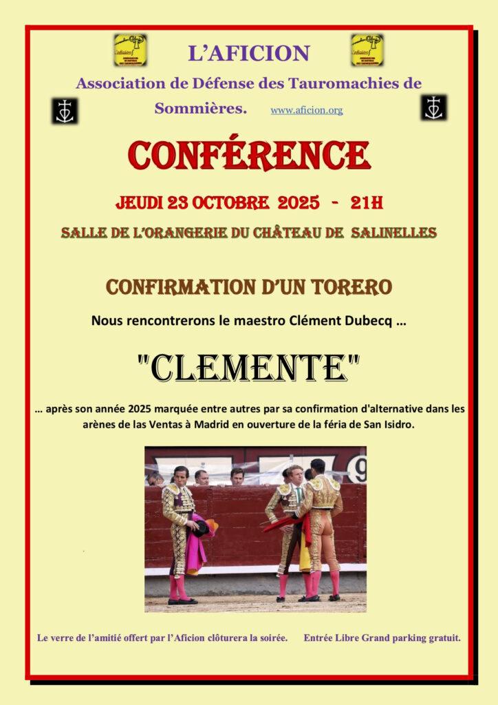 Jeudi 23 octobre, 21 heures. Se tiendra à la salle de l’orangeraie du château de Salinelles, une conférence « confirmation d’un torero » avec le matador Clemente. Entrée libre.