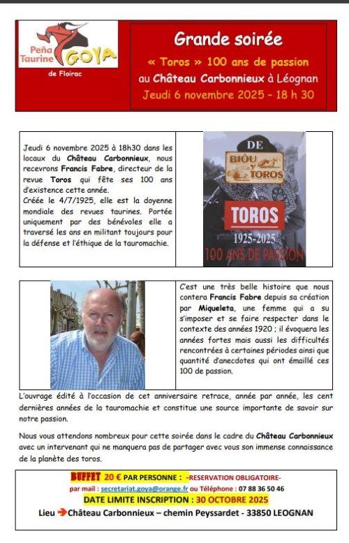 Le jeudi 6 novembre, grande soirée de la Peña Taurine Goya de Floirac au Château Carbonnieux à Léognan pour fêter les 100 ans de la revue Toros. Démarrage à 18h30. Puis buffet dinatoire (20€). Réservation obligatoire au 0788365046 ou secretariat.goya@orange.fr