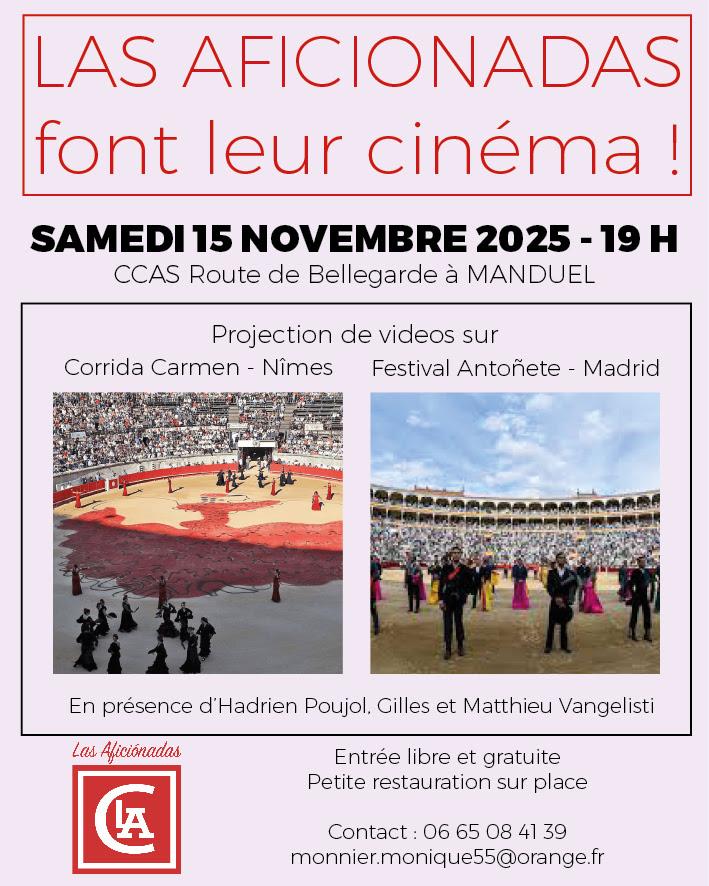 Les Aficionados font leur cinéma! Samedi 15 novembre à 19 heures au CCAS Route de Bellegarde à Manduel. Projection de vidéos sur la corrida Carmen de Nîmes et du Festival Antoñete de Madrid en présence d’Hadrien Poujol, Gilles et Matthieu Vangelisti. Entrée libre et gratuite.