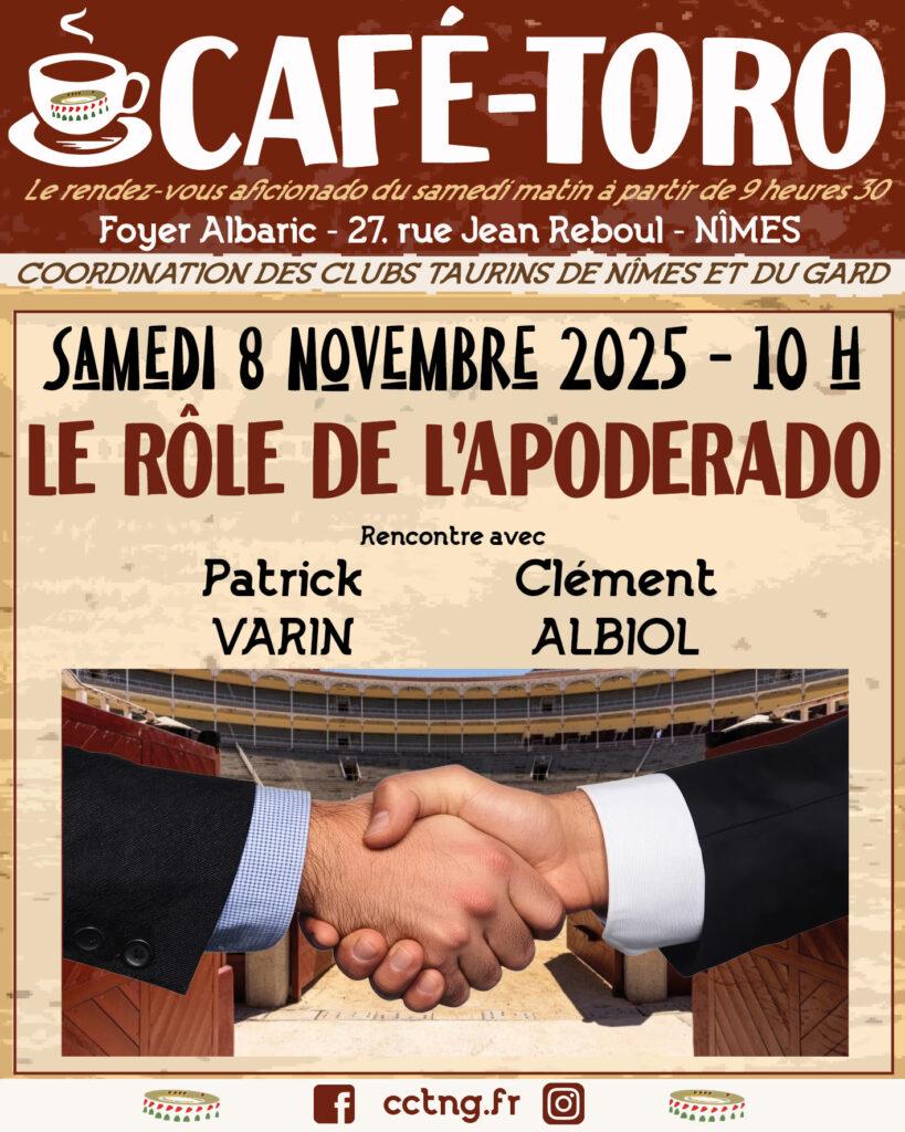 Pour en parler, le Café-Toro recevra ce samedi Patrick Varin qui veille aux destinées d’El Rafi et de Nino Julian et Clément « Raùl » Albiol, apoderado de Clément Hargous qui vient par ailleurs d’intégrer l’équipe managériale de Sánchez Vara. Entrée libre et gratuite. C’est toujours au 27 rue Jean Reboul à Nîmes à partir de 10 heures.