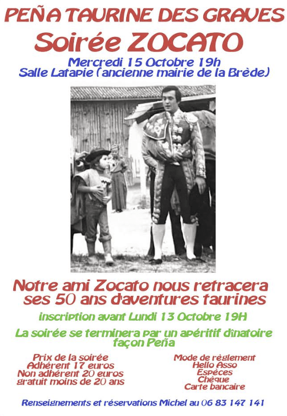 Mercredi 15 octobre à 19 heures, la Peña Taurine des Graves reçoit à la salle Latapie , un habitué des lieux Zocato. Il retracera à cette occasion, ses cinquante ans d’aventures taurines. Renseignements au 0683147141
