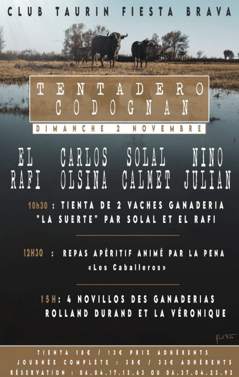 Et enfin le Dimanche 2 Novembre sur la commune voisine de Codognan, aura lieu un tentadero de 2 vaches le maƟn et de 4 novillos l’après-midi avec la participation des matadors de toros « El Rafi » « Solal » « Carlos Olsina » et du novillero « Nino Julian ». Le bétail est issu des ganaderia la Suerte , Durand et La Véronique.