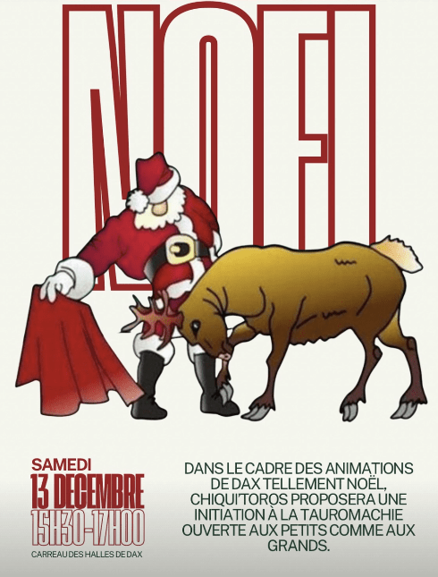 Dans le cadre des animations de Noel de la ville de Dax, Chiqui’Toros proposera une initiation à la tauromachie ouverte aux grands comme aux petits le samedi 13 décembre de 15h30 à 17h00 sur le carreau des Halles de Dax