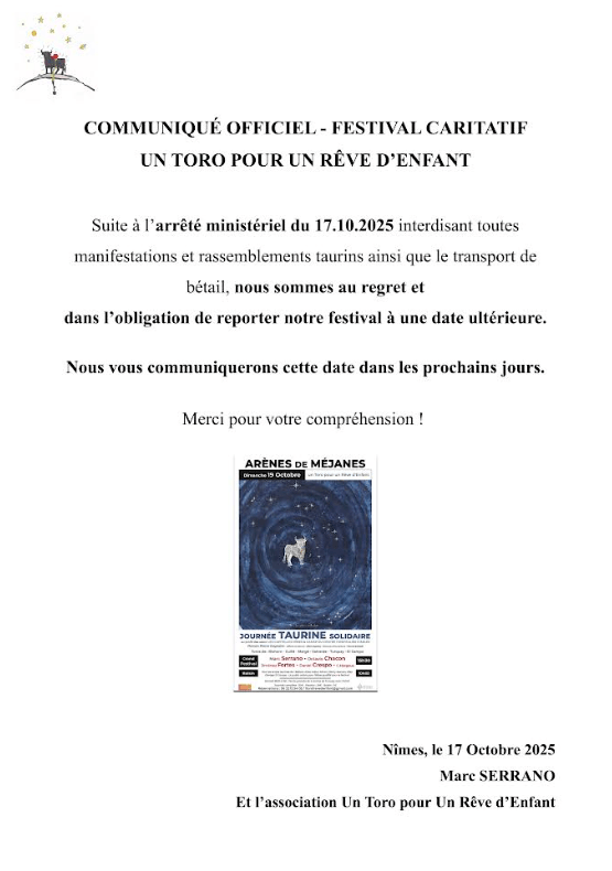 - report du festival « 1 Toro pour 1 rêve d’enfant à Méjanes, dimanche 19 octobre – la date sera communiquée ultérieurement