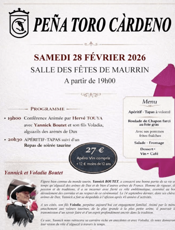 La Peña Toro Cardeno organise le samedi 28 février -19h- une conférence à la salle des fêtes de Maurrin.