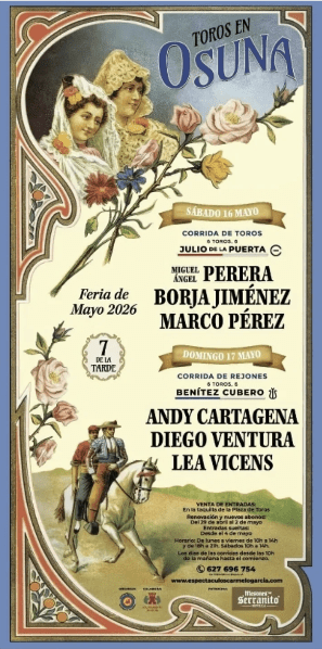 Espectáculos Carmelo García a présenté les cartels de la Feria Taurine de Mai d’Osuna. Le cycle se compose d’une corrida de toros et d’un festejo de rejones, avec les combinaisons suivantes :