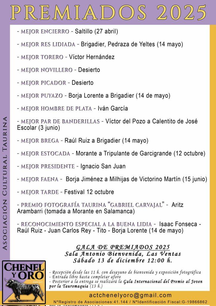 L’Association Taurine Chenel y Oro tiendra prochainement sa cérémonie annuelle dans la salle Antonio Bienvenida des arènes de Las Ventas, à Madrid. L’événement mettra à l’honneur le torero Borja Jiménez, désigné lauréat du prix de la Meilleure Faena de l’Année 2025.