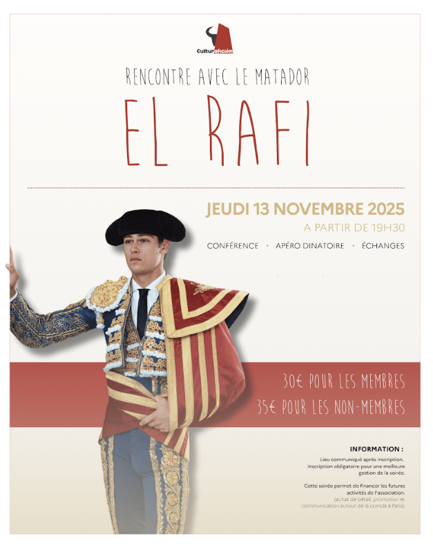 Culturafición , peña taurine très active de Paris, recevra le matador français El Rafi ce jeudi 13 novembre, à partir de 19h30, dans un bar / restaurant de la capitale (lieu annoncé après l’inscription). Conférence , apéro dinatoîre et écchanges sont au programme. 30€ pour les mebres, 35€ pour les non membres.