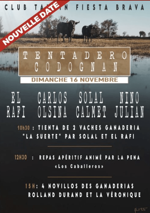 Suite à l’interdiction du déplacement des bovins sur tout le territoire jusqu’au 4 novembre, ce qui a eu pour conséquence le report de la journée taurine du 2 novembre organisée par le CT Fiesta Brava, la nouvelle date arrêtée par l’organisation est le dimanche 16 novembre
