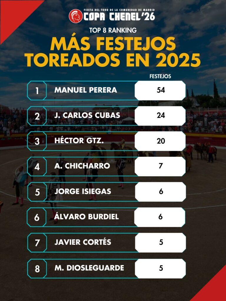 Alejandro Chicharro occupe la quatrième place avec 7 corridas. Jorge Isiegas et Álvaro Burdiel se partagent la cinquième position avec 6 prestations chacun. Ce top 8 est complété par Javier Cortés et Manuel Diosleguarde, avec 5 festejos toréés.