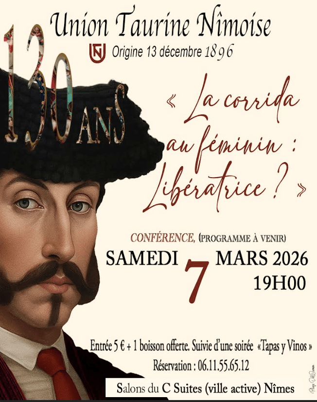 Dans le cadre de ses 130 ans, l’Union Taurine Nîmoise, organise une conférence le Samedi 7 Mars à 19 heures dans les salons du C.SUITES en ville active à Nîmes. Le programme définitif sortira dans une quinzaine de jours. Le thème lui est déjà connu : la tauromachie féminine, libératrice? Participation 5€. Réservation 0611556512.