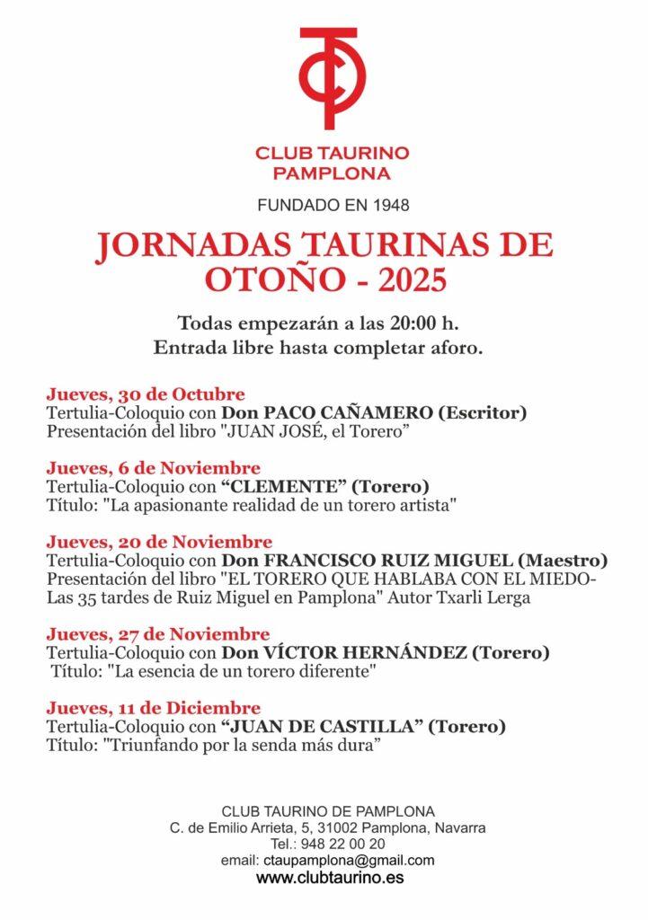 En attendant peut-être de l’être dans le ruedo, Clemente sera bientôt reçu par le club taurin de Pampelune. Ce sera pour une conférence. Elle aura lieu le jeudi 6 novembre à compter de 20 heures au siège de la peña. Pour les frontaliers, c’est une occasion de passer un moment taurin en bonne compagnie. Le programme des journées taurines d’automne du Club Taurin de Pampelune est par ailleurs le suivant :