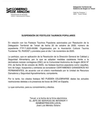 En Aragon, les fêtes taurines populaires sont suspendues en raison de l’apparition de la dermatose nodulaire chez les vaches. Ces festejos populares doivent se tenir le 1er novembre , date à laquelle, la France lèves les interdictions. Il est bien possible que « Tras los Montes », les mesures sanitaires n’aient pas eu le même caractère strict que dans l’hexagone. L’Aragon et la Catalogne sont particulièrement touchées. Un plan de vaccination massive est en cours. A surveiller l’évolution de près.