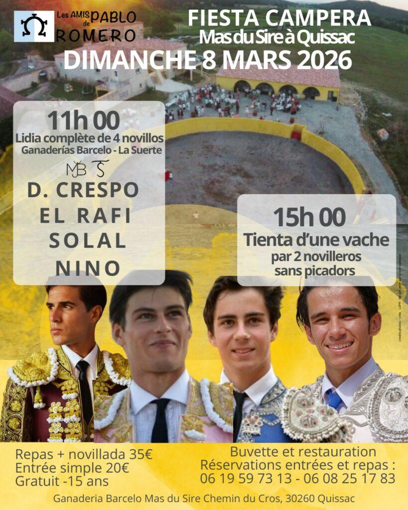 Le dimanche 8 mars 2026, les Amis de Pablo Romero vous donne rendez-vous dans le magnifique cadre du Mas du Sire à Quissac pour leur Fiesta Campera.