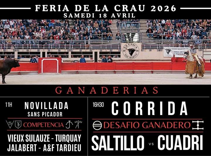 La feria de la Crau côté taurin aura lieu le samedi 18 avril prochain. La journée se composera d’une novillada matinale sans picadors avec les élevages du Vieux Sulauze, Turquay, Jalabert et Tardieu. Pour l’après-midi, fidèle à sa tradition toriste, Saint Martin va proposer un désafio Saltillo/Cuadri. Les cartels piétons seront annoncés le samedi 17 janvier, à 19h, à la en salle Aqui Sian Ben.