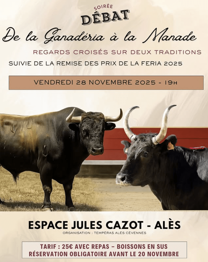 Soirée-débat “De la Ganadéria à la Manade”, vendredi 28 novembre à 19h aux Arènes d’Alès. Avec des éleveurs de toros espagnols et des manadiers, suivie de la remise des prix de la Féria 2025 avec repas. Réservations obligatoires avant le 20 novembre !