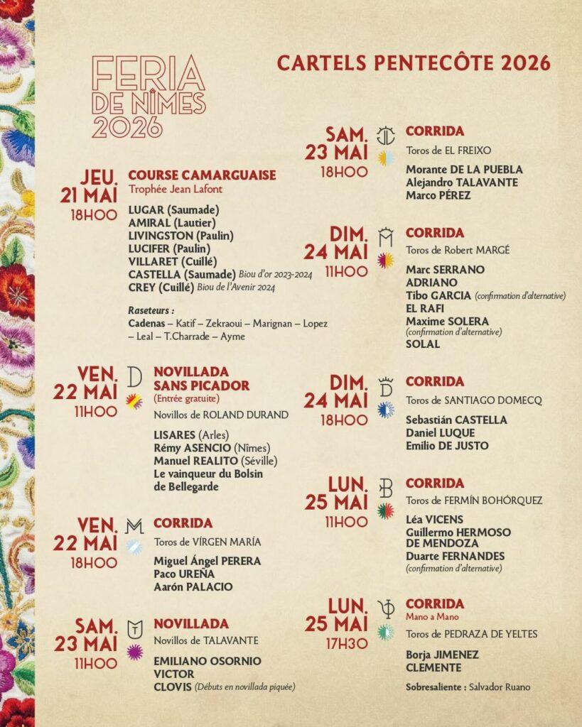 Simon Casas a présenté les cartels 2026 de la feria de Pentecote à Nimes. Morante sera bien présent comme annoncé. La feria fait place à la tauromachie française. Victor et Clovis seront présents pour la novillada, ce dernier faisant ses début dans l’escalafon avec picadors. Il y aura Sébastien Castella. Clemente se voit offrir un mano a mano avec Borja Jimenez. Il y aura aussi une corrida 100% française. Les toros de Margé seront affrontés par six toreros français. Marc Serrano sera chef de lidia etr retrouvera l’arène où il a pris son alternative il y a 26 ans. Adriano, Rafi, Tibo Garcia , Maxime Solera et Solal se voit offrir l’opportunité sur un toro de marquer les esprits (au contraire des toreros du sud-ouest). Léa Vicens représentera la tauromachie française à cheval quant à elle.