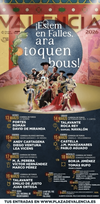 Six corridas de toros, deux novilladas avec picadors, une corrida de rejones, une novillada sans picadors composent le cycle des Fallas 2026. Par ailleurs, a également été annoncée la traditionnelle novillada de la Virgen de los Desamparados, incluse dans l’abonnement des Fallas et programmée le samedi 9 mai.