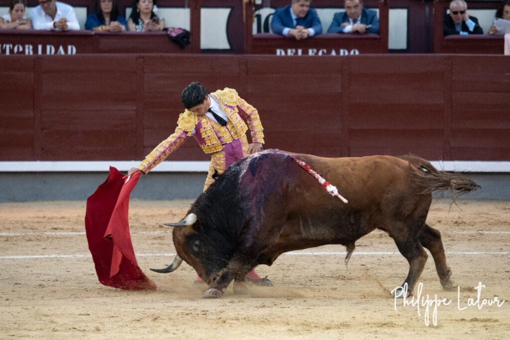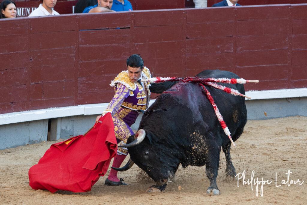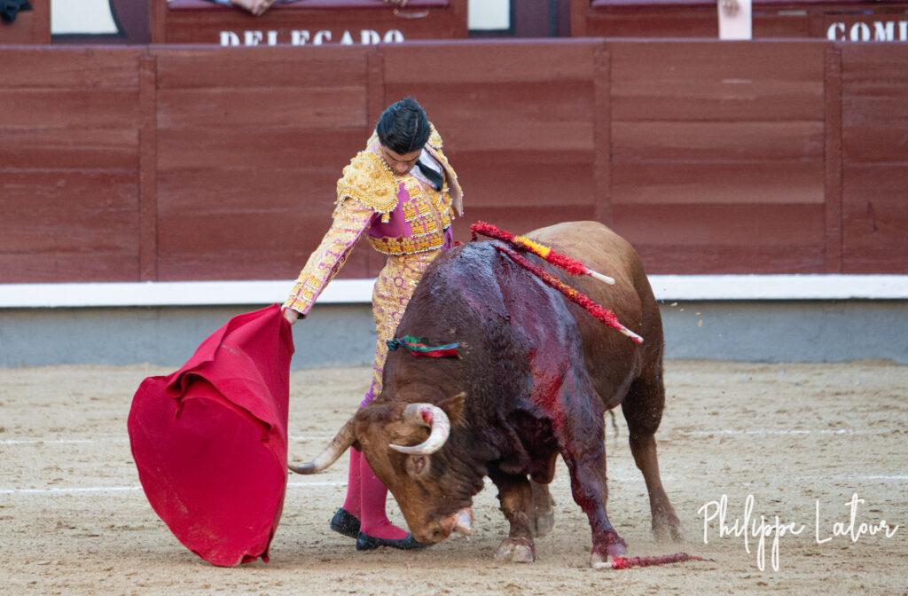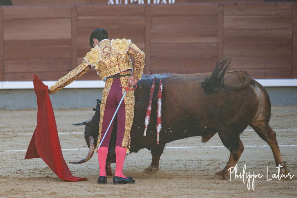 Quelques coups de capes laissent espérer un mieux côté bovin. Le Domingo reste longuement collé au peto même s’il manque de puissance en deux fois. Ce 4° est le moins mauvais de l’envoi (attention pas le meilleur, nuance de taille). Il tient à peu prés debout et charge…mais il le fait sans classe..Talavante dans une faena désincarnée occupe longuement le terrain et finit par agacer le public. L’engagement à l’épée est équivalent à celui montré avec la flanelle. Silence pour l’un, sifflets pour l’autre.
