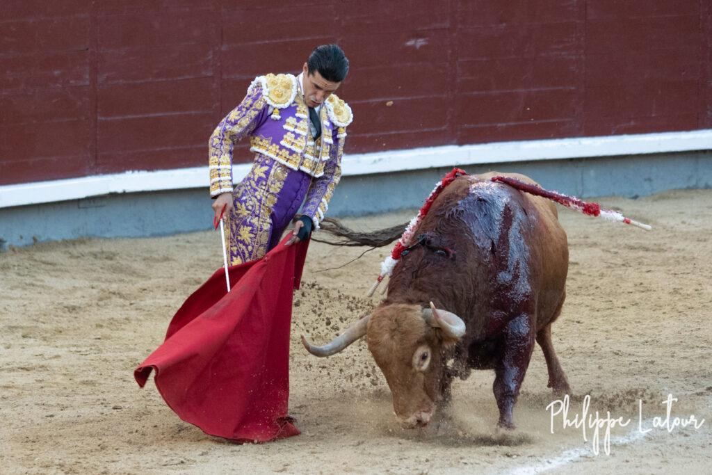 Encore une bête qui n’a qu’une envie celle de repartir d’où elle est sortie.. L’envie de sauter au callejon se fait sentir. Dans le capote de Pablo Aguado, un extraño sur la droite ne présage rien de bon..Deux piques appuyées calment les ardeurs de fuite du castaño. Aux banderilles, par deux fois, le Domingo coupe Mambru sur la corne droite. Au dernier, ce n’est pas un toro bravo mais un charolais qui de plus semble avoir des problèmes pour respirer. Le sévillan abrège au bonheur de tous. Silence pour le torero et pitos pour l’arrastre.